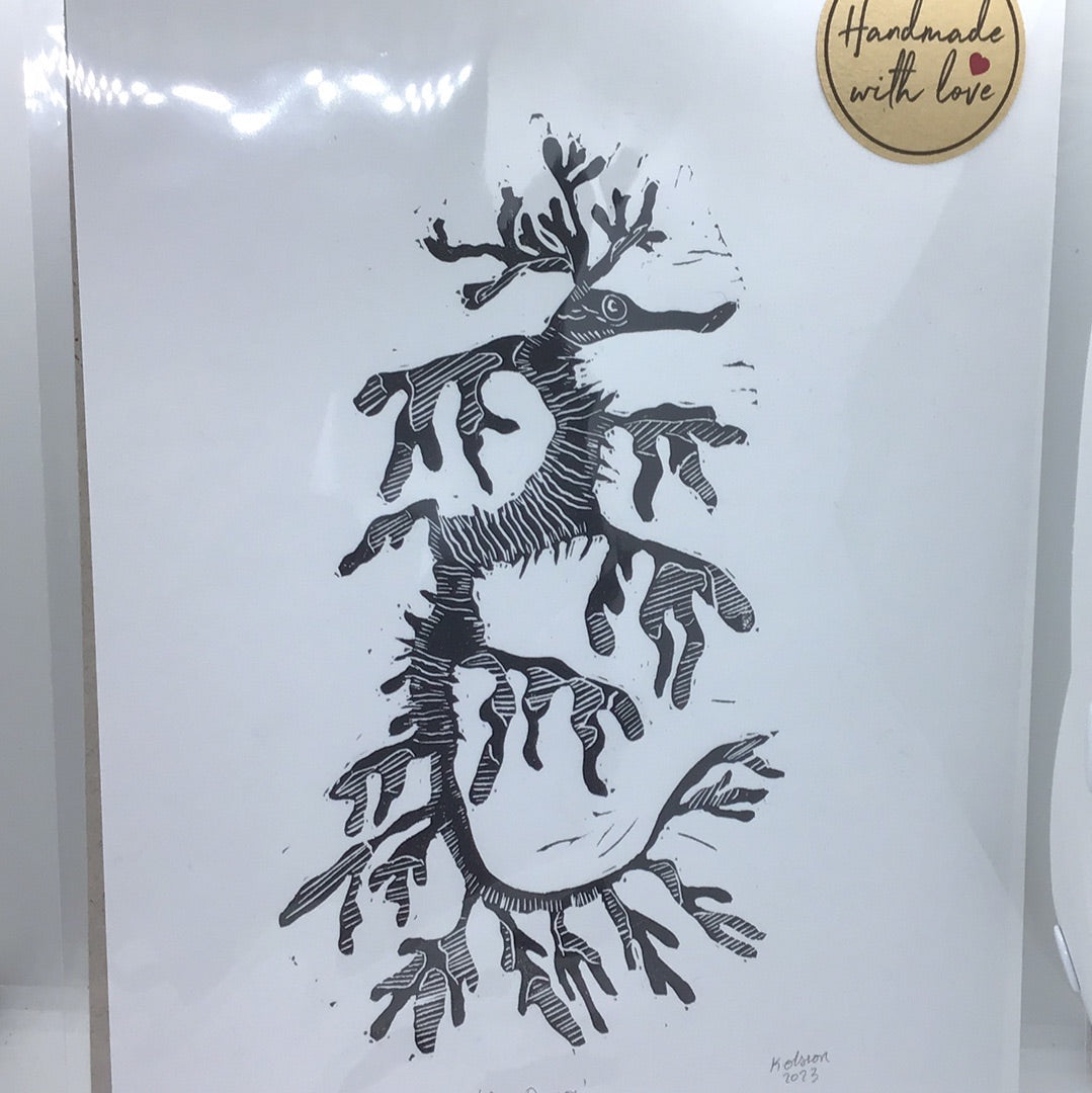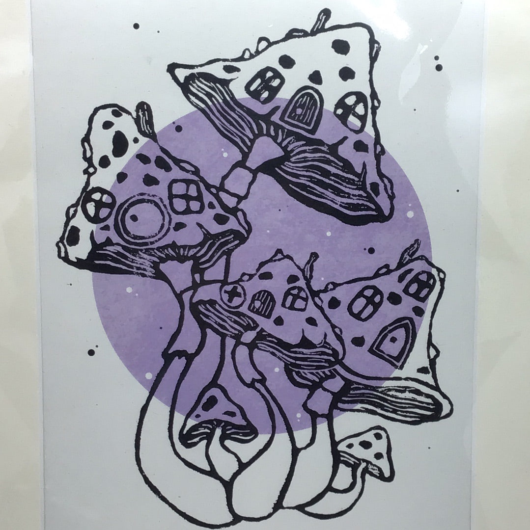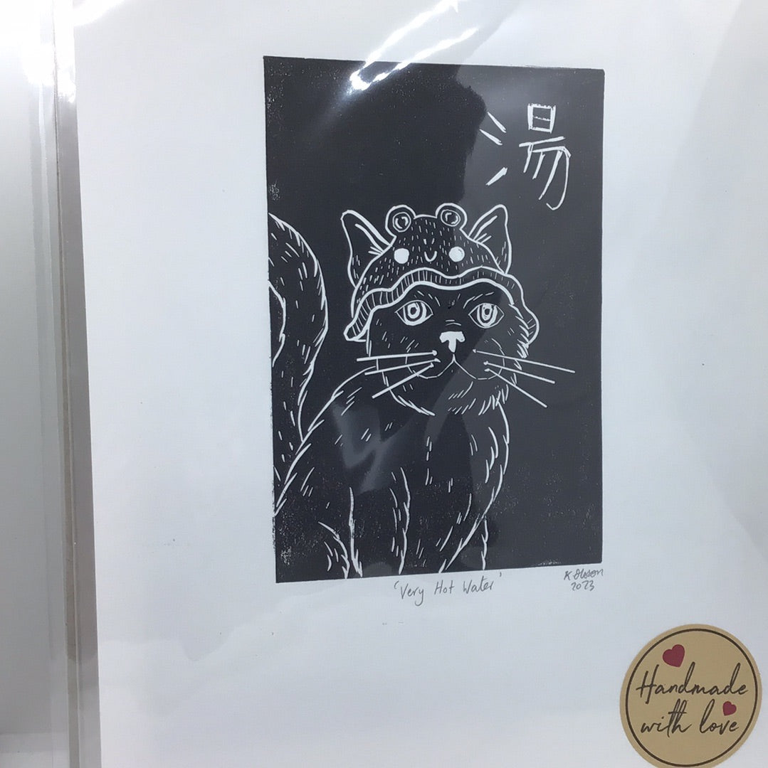 A4 Lino prints made by illustrator Kat Olsson in York: Skulls and mushrooms; Toadstools; Mouse Tea Party; Very Hot Water cat in frog hat; Chicken Little; Trippy Hippy