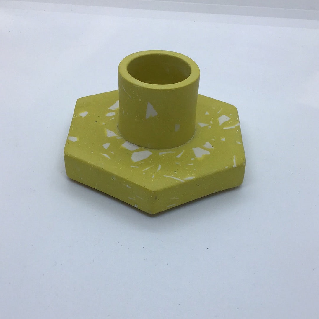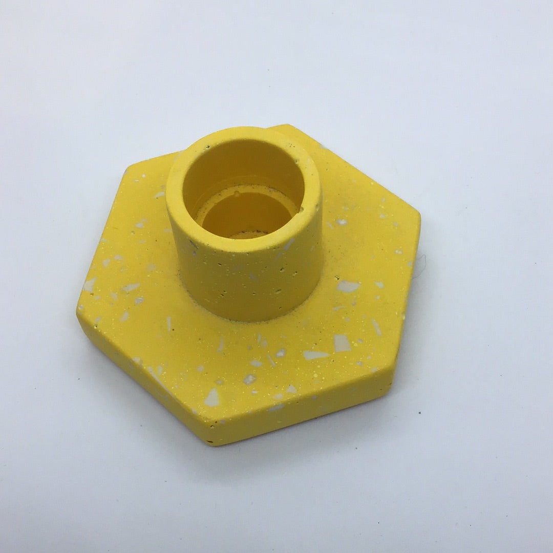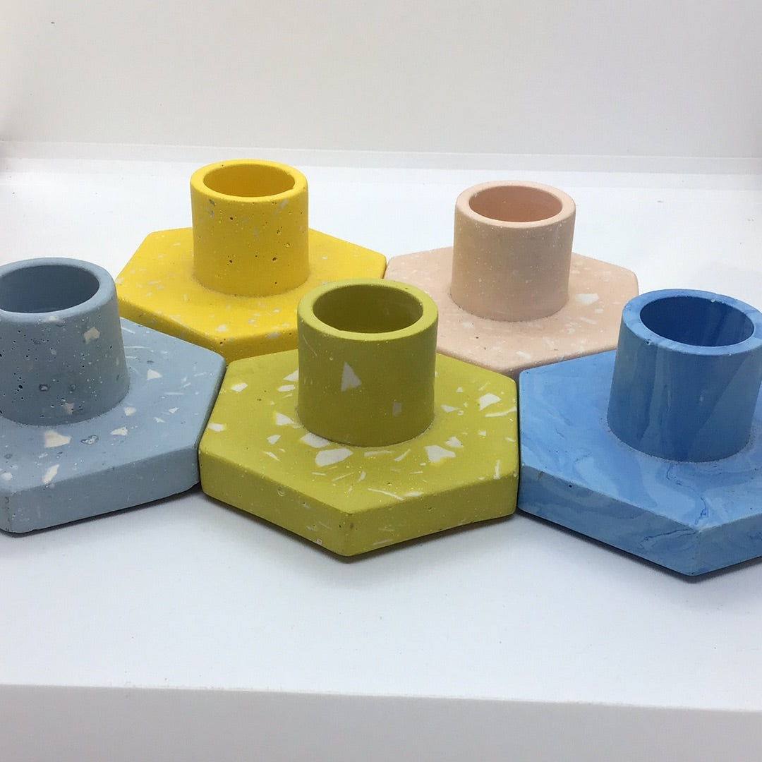 Colourful hexagon based candle stick holders hand made out of jesmonite by Hayley North in Yorkshire