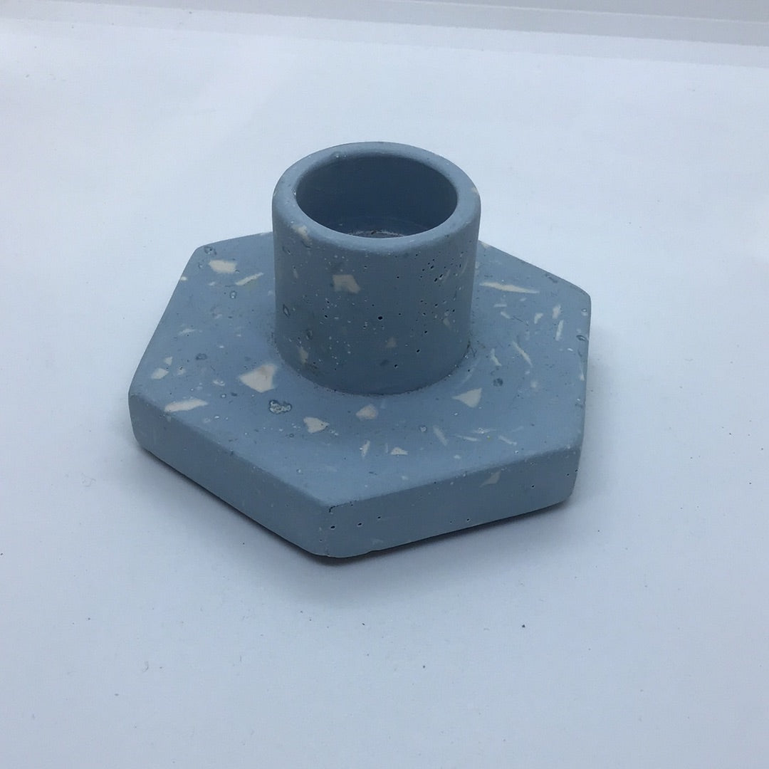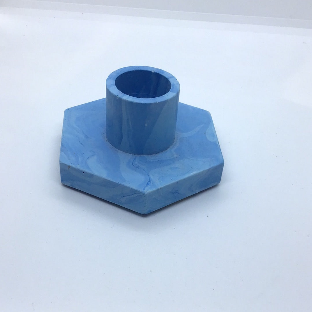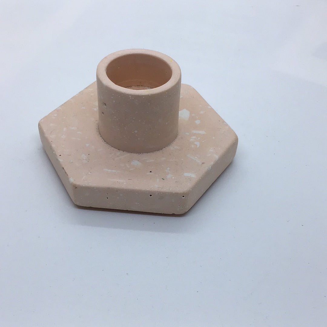 Colourful hexagon based candle stick holders hand made out of jesmonite by Hayley North in Yorkshire