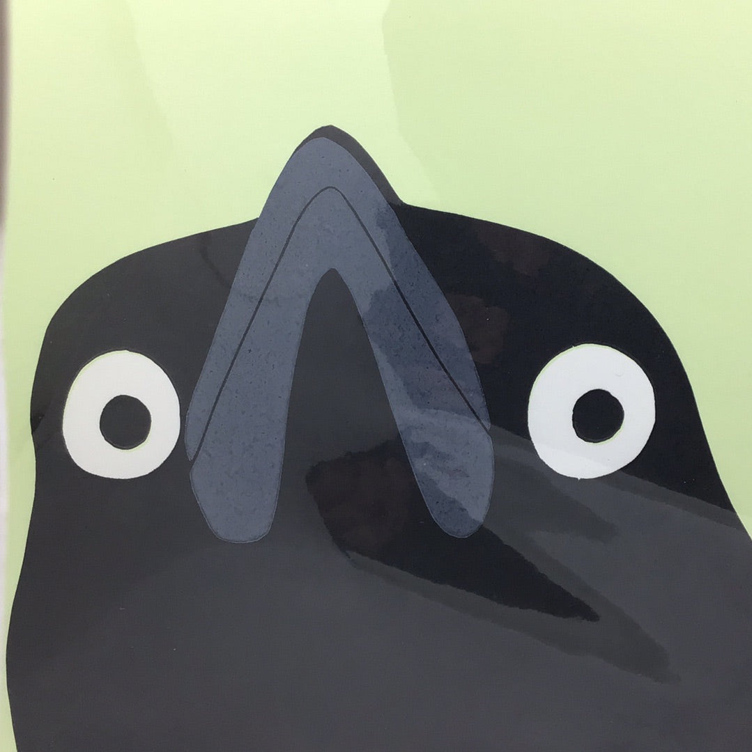 Green Lino print Crow bird by Danielle House close up. He’s always watching…